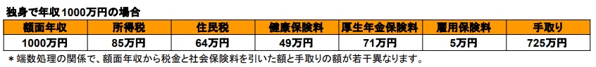 額面1000万円ー所得税約85万円ー住民税約64万円ー社会保険料約125万円