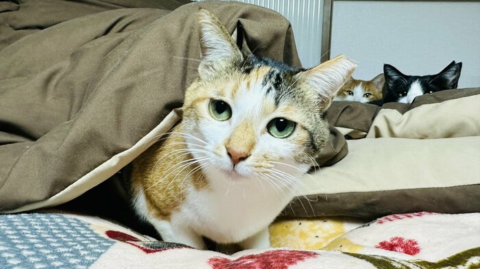 布団からチラッ!猫の「ちび太」ちゃんが話題に