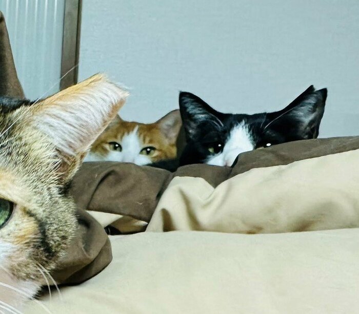 投稿主さんのご自宅では、保護猫6匹と家で生まれた3匹、合計9匹の猫ちゃんが暮らしているそうです。ちび太ちゃんの後ろをよく見てみると……?2匹の同居猫ちゃんが視線を送っていました!