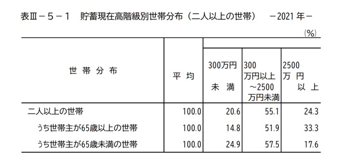 同資料より、二人以上の世帯で、うち世帯主が65歳以上の世帯の貯蓄現在高の階級別の世帯分布も確認しましょう。