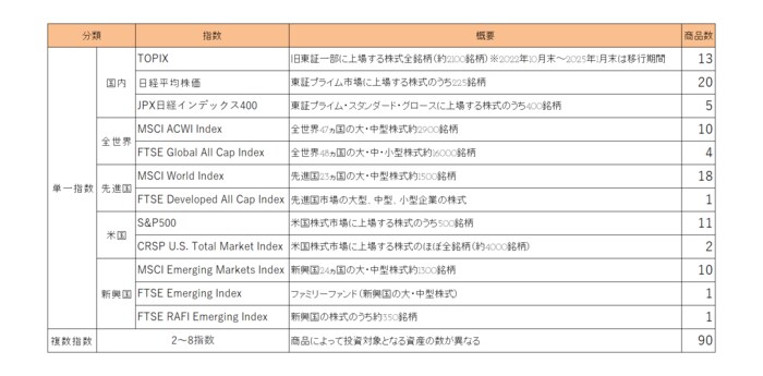 つみたてNISAのインデックス投資信託の主な指数別の本数とは