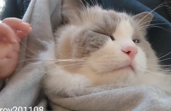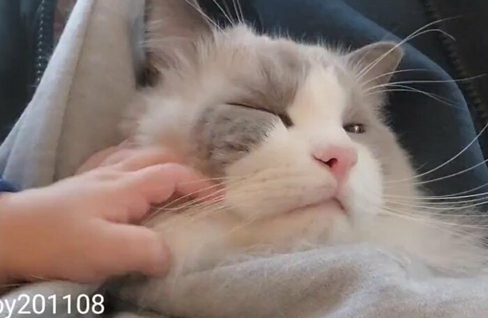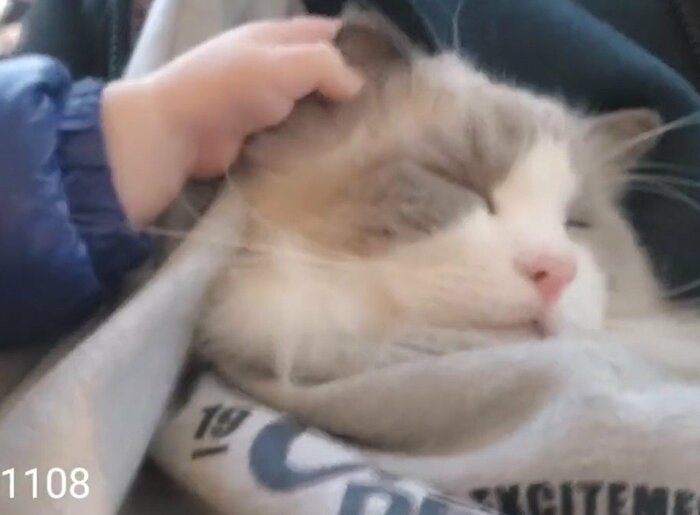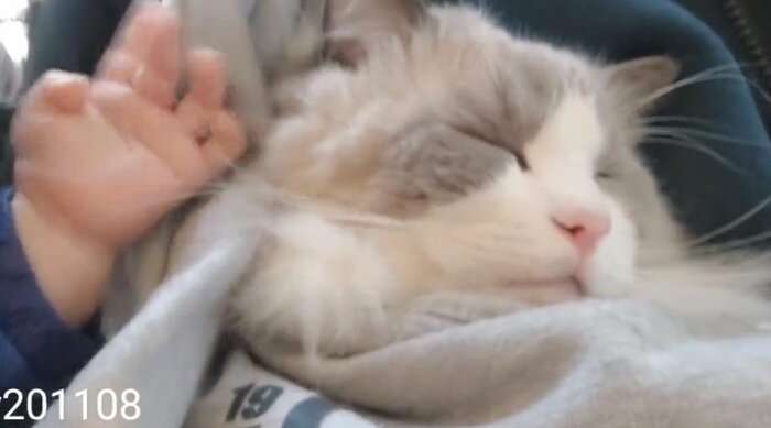 投稿された動画には、ラグドールの男の子「ロイ」くんと、赤ちゃんの手が写っています。ロイくんは飼い主さんに抱っこされながら、赤ちゃんにナデナデされている様子……!