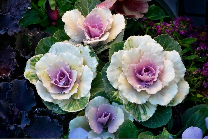 正月の飾りにもよく使われるハボタンは寄せ植えにオススメの多年草。ハボタンだけの寄せ植えでも十分お洒落になります。