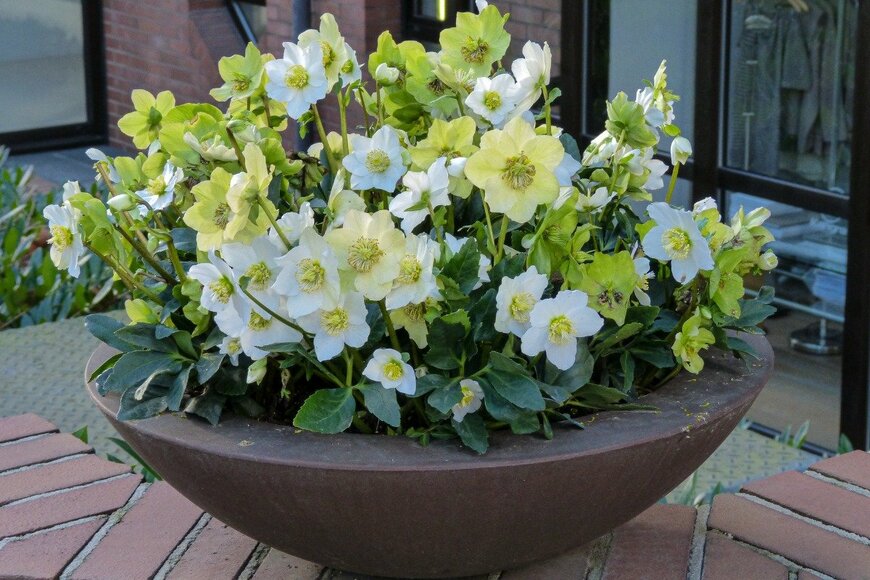 気品のある佇まいのクリスマスローズは鉢植えでも地植えでも育てることができる多年草。玄関の空いたスペースに植えるか、鉢植えで楽しみましょう。高温多湿を嫌うので、地植えにする場合は植える場所をよく選んでくださいね。