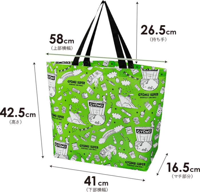サイズ:高さ42.5cm×下部横幅41.0cm×上部横幅58.0cm×マチ部分16.5cm×持ち手26.5cm