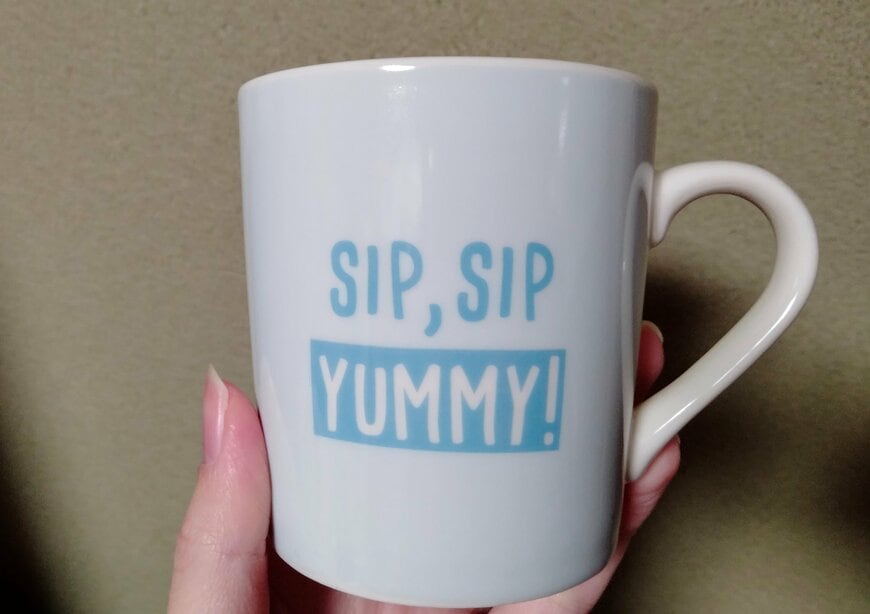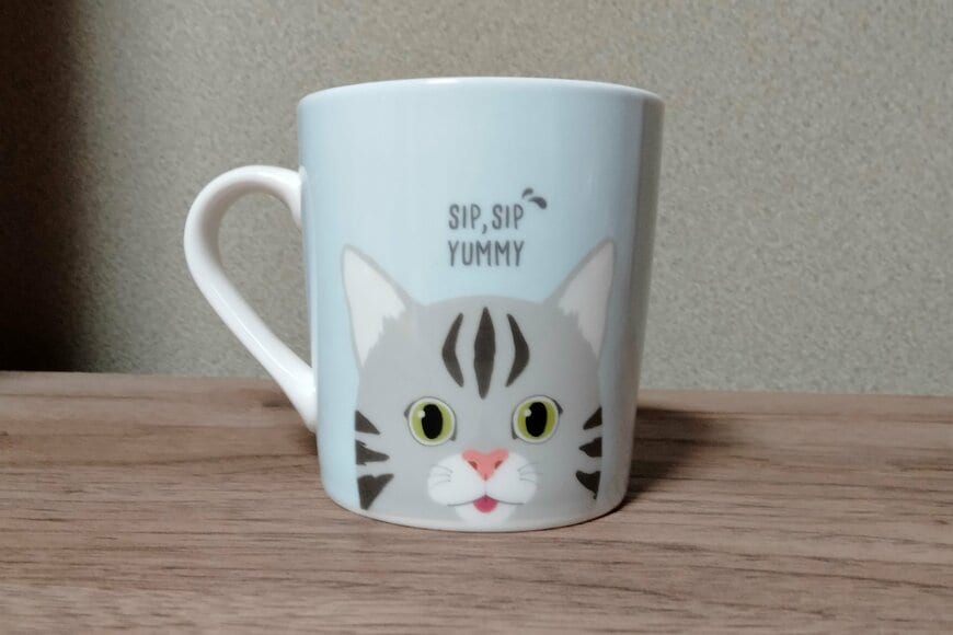 こちらがダイソーで販売されている「ノーズマグカップ」です。「SIP,SIP YUMMY」と猫が喋っているようなデザインです。