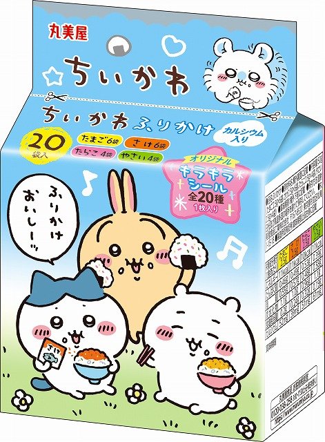 パッケージは、ふりかけを食べる“ちいかわ”たちがかわいい描き下ろしイラストを採用。小袋タイプなので、食卓でもお弁当でも使えるので便利。カルシウム入りなので、お子さまの成長期にもぴったり。中身は、<たまご>6袋、<さけ>6袋、<たらこ>4袋、<やさい>4袋、計20袋となっています。