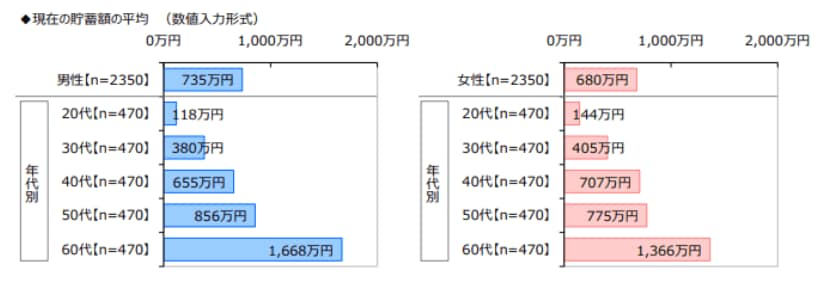 男性の貯蓄額の平均は735万円、女性の貯蓄額の平均は680万円です。