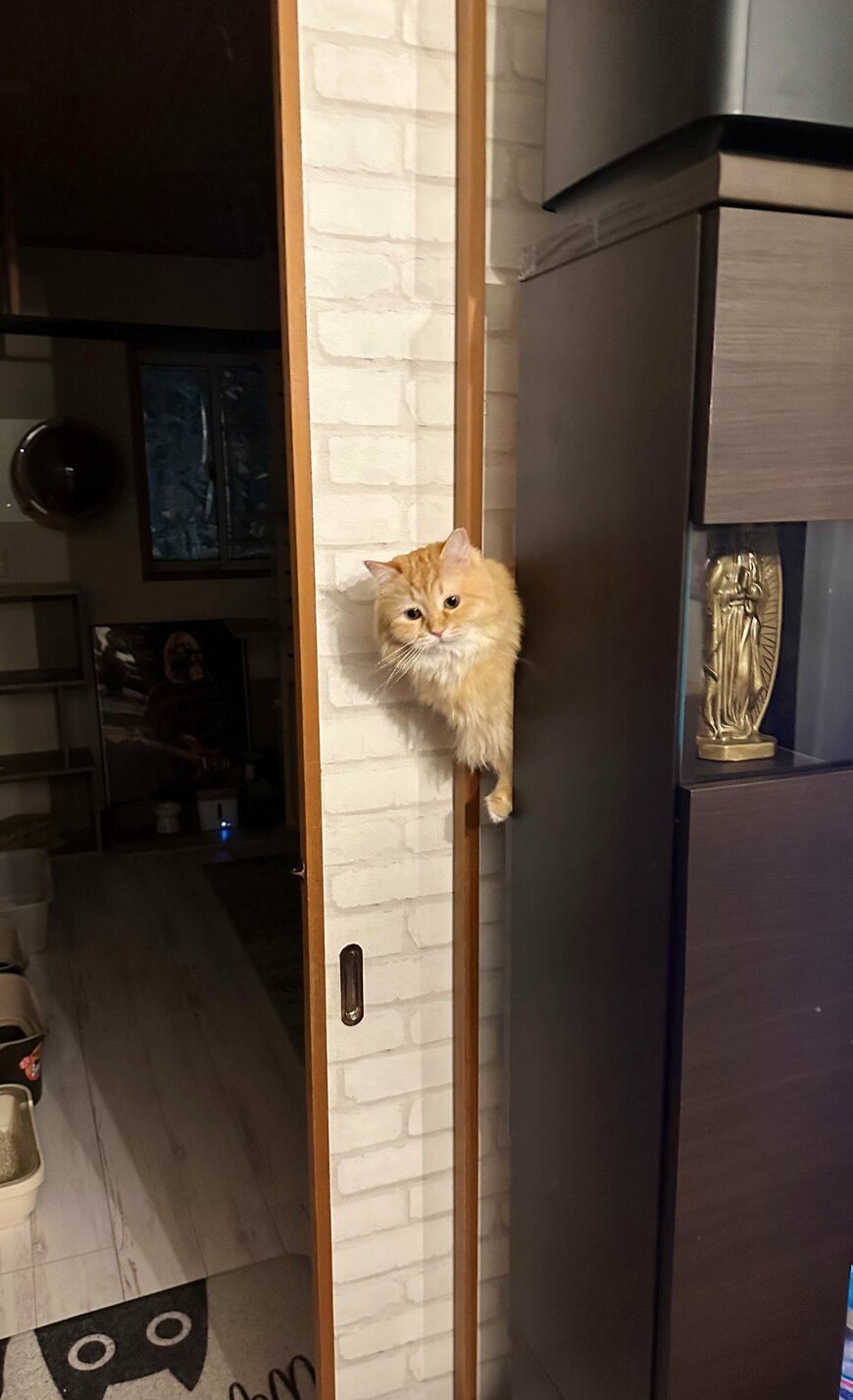 なんだか「どうしたの?待ってた?」なんてセリフが聞こえてきそうな表情に見えます。テレビの裏にすっぽりと入り込み、まるで生えているかのように顔を出す姿に、つい笑みがこぼれてしまいました。