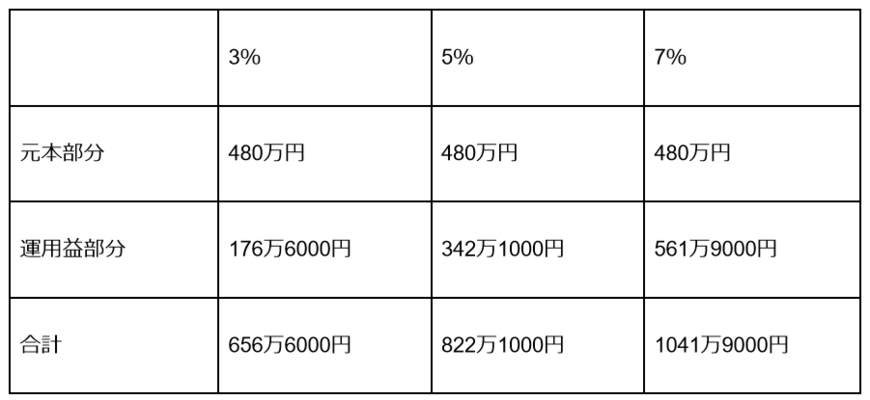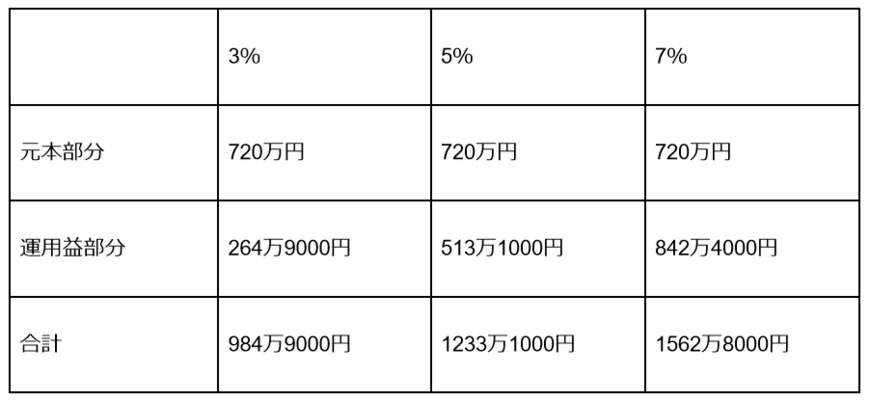 今回は年率3%、5%、7%の場合で運用できたと仮定して、それぞれシミュレーションしました。