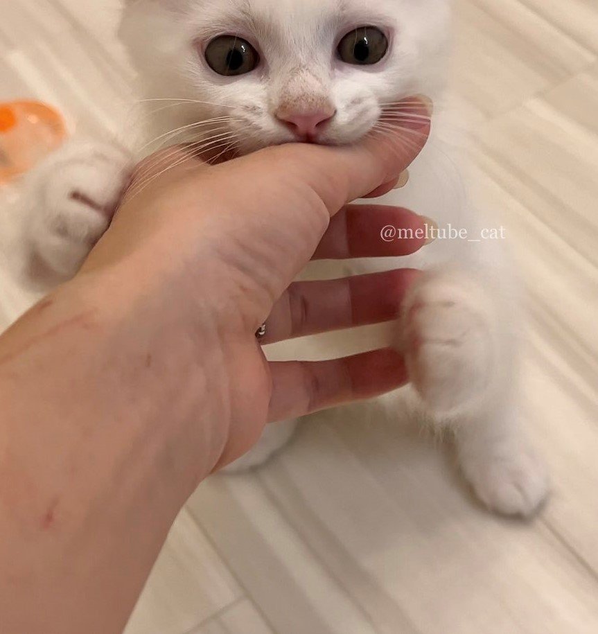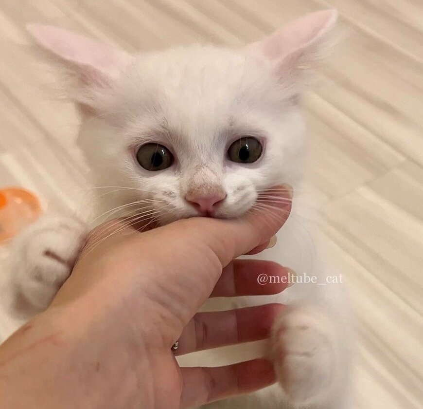 マオくんの表情をアップで見てみると……?ちっちゃなお口を使って飼い主さんの手にじゃれているのがわかりますね。