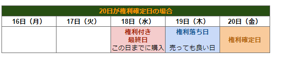 - 権利付き最終日:権利確定日の2営業日前!(この日までに株式を保有している必要があります)