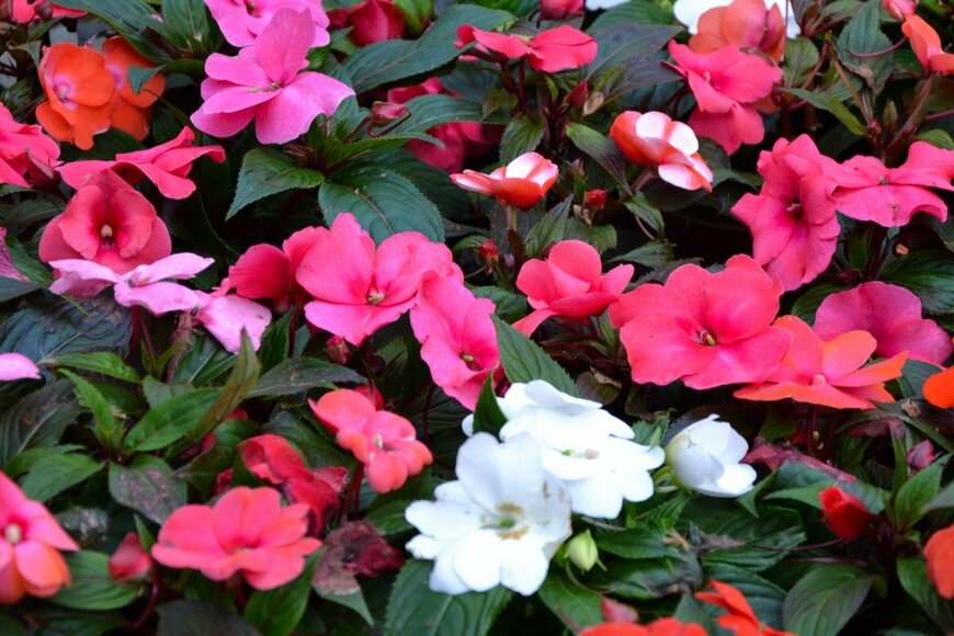 日陰の庭を好む一年草が少ないなか、華やかな雰囲気でシェードガーデンを彩るのがインパチェンス。耐陰性が高く、春から秋にかけて長い間花が楽しめる一年草です。