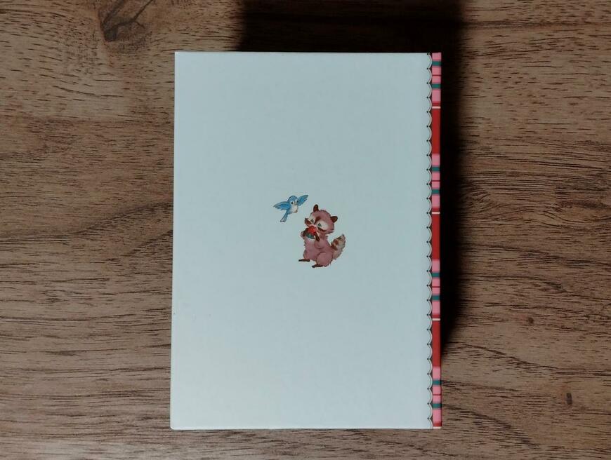 裏面は、アライグマが鳥と遊んでいるデザインです。幸福を呼んでくれそうな青い鳥がかわいいです。
