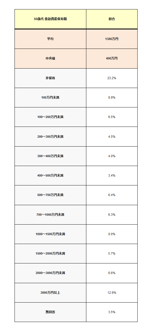 定年前「50歳代」の平均貯蓄額はいくらか。中央値とも比較