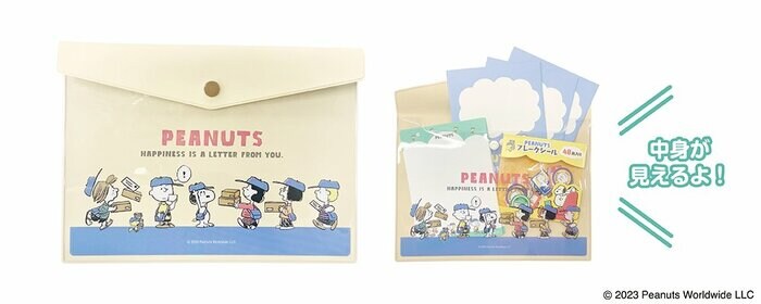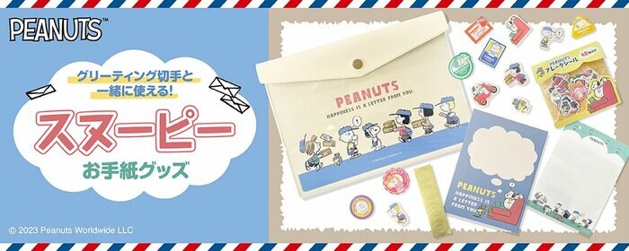 同日日本郵便株式会社より発行されたグリーティング切手『スヌーピーとピーナッツのなかまたち』の登場に合わせた、一緒に使えるお手紙グッズとなっており「レターセット」、「フレークシール」、「ステーショナリーポーチ」の3アイテムがそろいました。