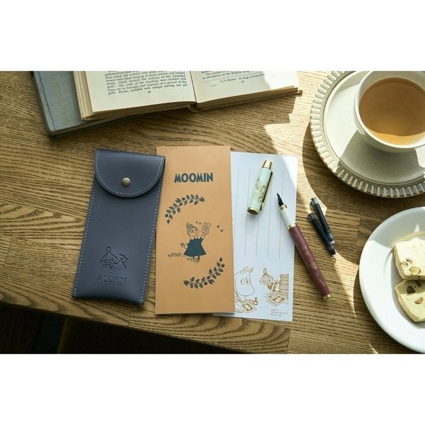 大人かわいいムーミンの万年筆とペンケース、ひとこと便箋がセットになりました。シックな色合いが大人かわいい万年筆とレザー調のペンケース、ひとこと便箋と、豪華な組み合わせ。万年筆はインクカートリッジが2本もついています。