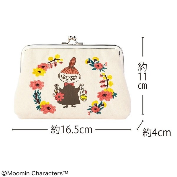 鮮やかなお花の刺しゅうに囲まれたリトルミイが愛らしいですね。ポーチの裏地はぱっと目を引くオレンジで、中綿入りのふわふわな質感なので、コスメや充電器など収納するのにぴったりです。