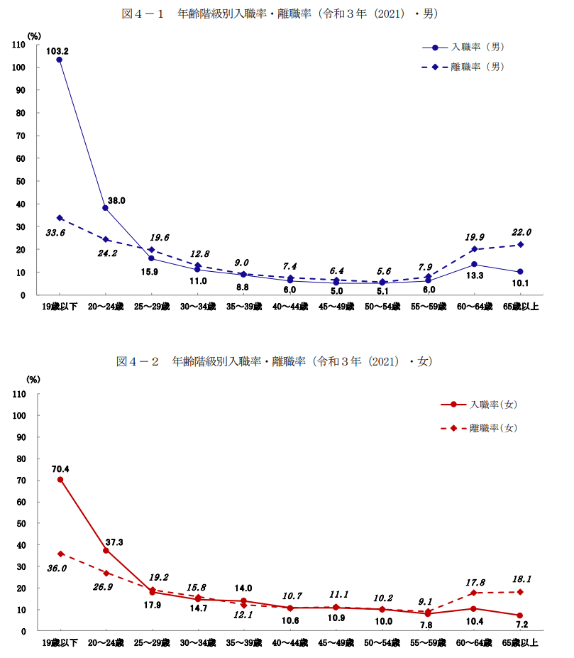2022年8月31日に公表された厚生労働省「令和3年雇用動向調査結果の概況」によると、年代別の入職率と離職率は以下のとおりです。