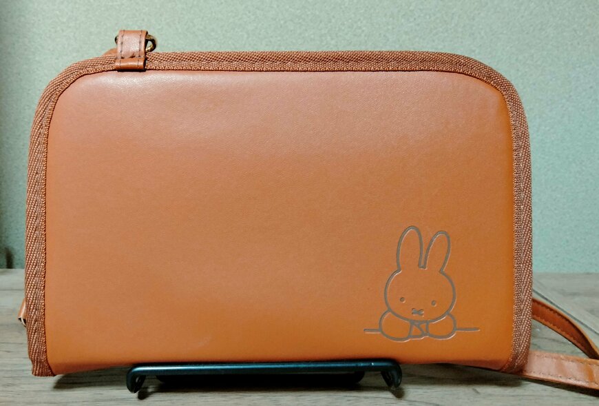 こちらが宝島社から出版された「miffyカードがたっぷり入るお財布ポーチBOOK」の付録の「カードがたっぷり入るお財布ポーチ」です。レザー調の生地がおしゃれなアイテムです。