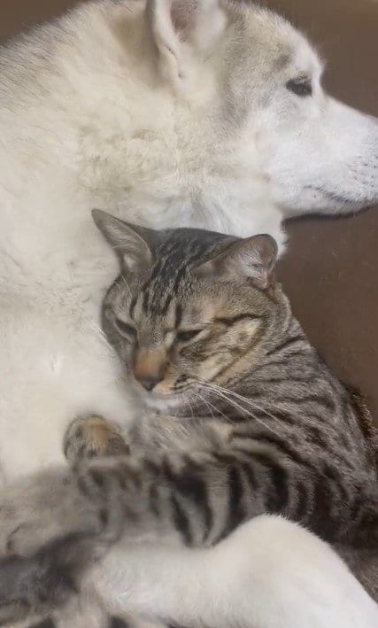 まるで親子……!足をカキカキするサンくんと、寝かしつけているかのようなユキちゃん