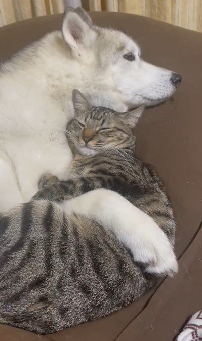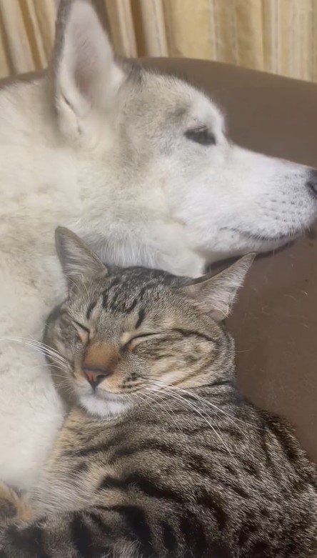 リプライ欄には、「モゾモゾしてまた眠る猫ちゃんを、ワンちゃんが寝かしつけているみたい……!」「信頼関係ですね。本当に幸せそうな表情です」「永久保存版にして、これから何度も見たいくらい素晴らしい動画」「これからも、どうか幸せに過ごしてね!」など、さまざまな書き込みが集まっています。