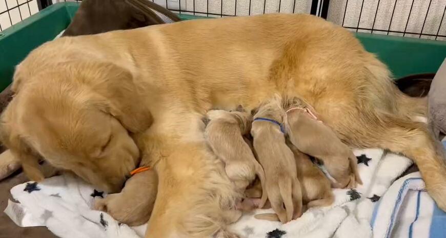 写っているのは、ゴールデンレトリバーの女の子「ぷぅ」ちゃん。そしてお腹の近くには小さな仔犬たちが集まっていました……!