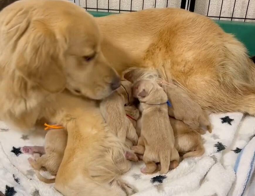 出産後、8頭の赤ちゃんたちの子育てに励んでいるというぷぅちゃん。動画の冒頭には、胸元にいる赤ちゃんをそっと毛づくろいする姿がおさめられていました。