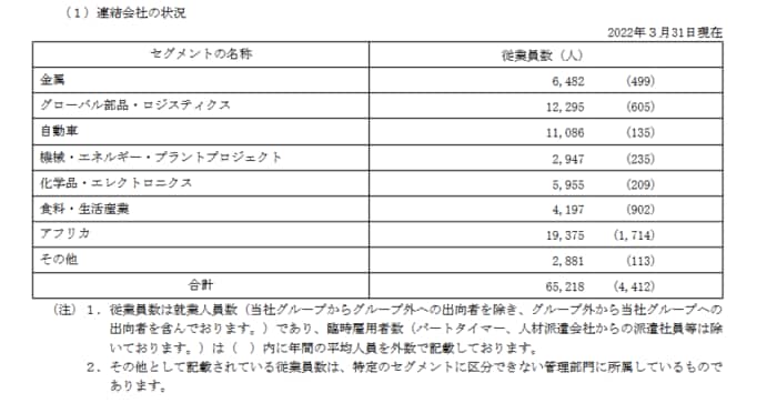 豊田通商の給料はいくらか。平均年齢・勤続年数も【2022年更新版】 就職と転職の企業調査・分析シリーズ 2023.02.07 03:50 公開 執筆者LIMO編集部 copy URL 目次[開く] 1. 豊田通商の平均年間給与はいくらか 2. 豊田通商の従業員数は何人か 3. まとめにかえて 参考資料 2. 豊田通商の従業員数は何人か また、連結会社における従業員数は以下の通りです。 出所:豊田通商「有価証券報告書」 金属:6482人 グローバル部品・ロジスティクス:1万2295人 自動車:1万1086人 機械・エネルギー・プラントプロジェクト:2947人 化学品・エレクトロニクス:5955人 食料・生活産業:4197人 アフリカ 1万9375人 その他 2881人 合計 6万5218人 3. まとめにかえて < 1 2 3 4 > 関連タグ #転職 #就職 #豊田通商 #年収 注目コンテンツ 【キャラつくAI】プロフィールをもとにAIがあなたをイメージして絵を描きます![PR] 上皮内がんも対象になるがん保険。1番人気のがん保険は?[PR] 持病があっても入りやすい医療保険。人気の保険はこの保険![PR]