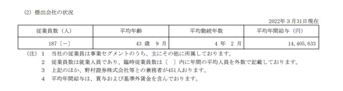 野村ホールディングス(提出会社)の2022年3月末時点での従業員数、平均年齢、平均勤続年数および平均年間給与は以下の通りです。