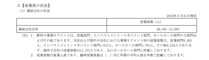 野村ホールディングスの給料はいくらか。平均年齢・勤続年数も【2022年更新版】 就職と転職の企業調査・分析シリーズ 2023.01.31 03:50 公開 執筆者LIMO編集部 copy URL 目次[開く] 1. 野村ホールディングスの平均年間給与はいくらか 2. 野村ホールディングスの従業員数は何人か 3. まとめにかえて 参考資料 2. 野村ホールディングスの従業員数は何人か また、連結会社における従業員数は以下の通りです。 出所:野村ホールディングス「有価証券報告書」 提出会社、および国内子会社 営業部門:8265人 インベストメント・マネジメント部門:1013人 ホールセール部門:1701人 その他:4234人 海外子会社 主にホールセール部門:1万1372人 連結会社合計 2万6585人 3. まとめにかえて < 1 2 3 4 > 関連タグ #就職 #面接 #給与 #年収 注目コンテンツ 三大疾病に備える!人気の三大疾病保険を比較[PR] 【キャラつくAI】プロフィールをもとにAIがあなたをイメージして絵を描きます![PR] 上皮内がんも対象になるがん保険。1番人気のがん保険は?[PR]