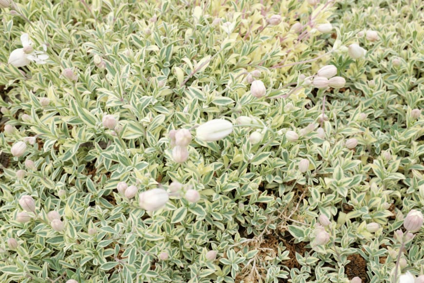 シレネ・ユニフローラはナデシコ科の多年草。春に咲く白い花はふっくらとした釣り鐘状でとても可憐です。小さな葉が密集して生え、緑にクリーム色の斑が入っています。