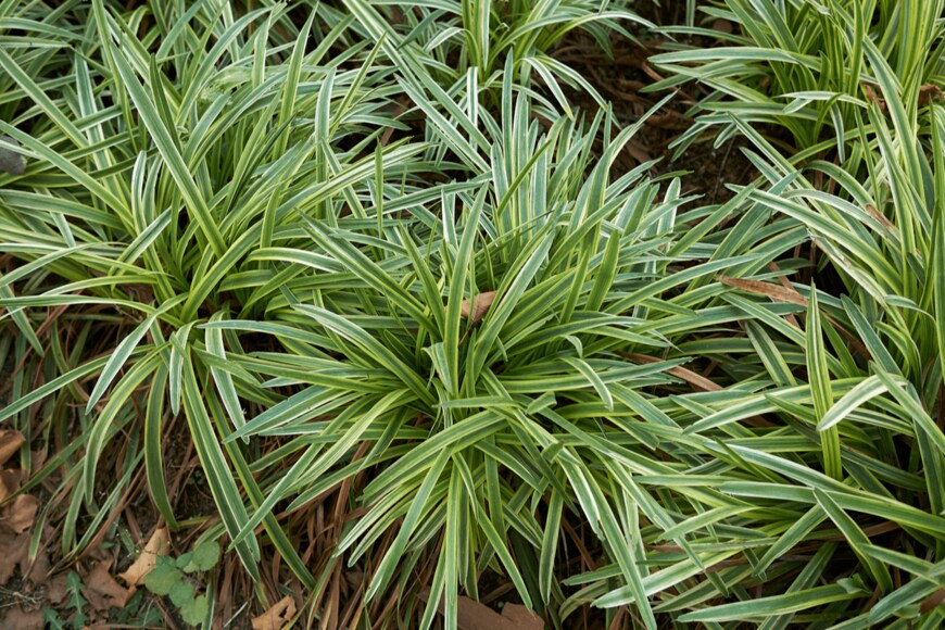 日本原産で「ヤブラン」という和名でもよく知られるリリオペ。細くてシャープな葉が四方八方に広がり、スタイリッシュな株姿です。なかでも白いラインの入った品種が人気。