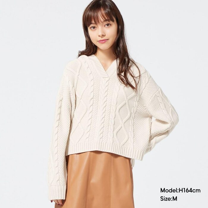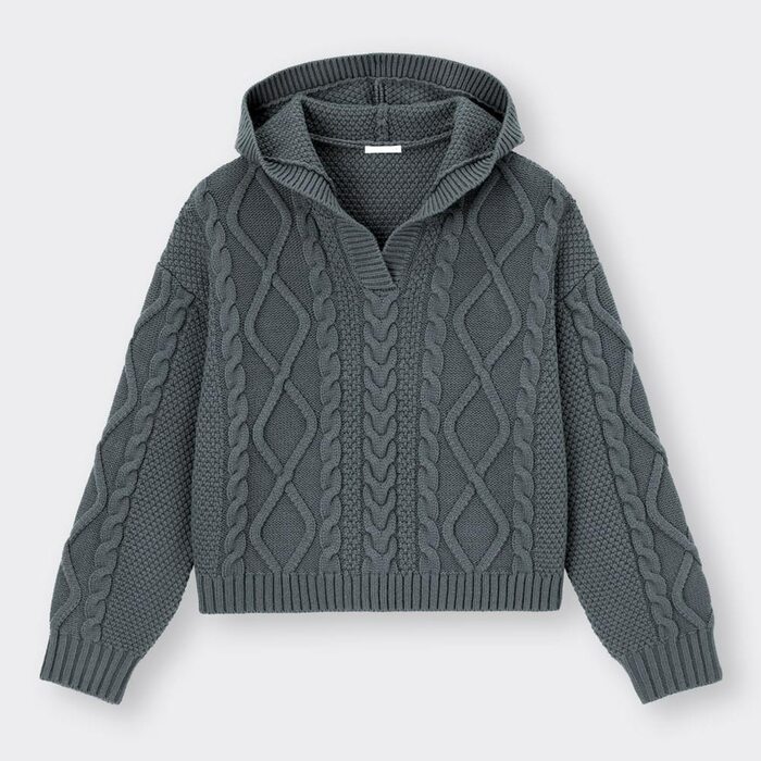ケーブル柄が冬らしい、フードが特徴的なセーターです。背中部分がかのこ編みになっているので、アウターの着ぶくれを押さえられます。ワイドクロップド丈なので、ワイドパンツと合わせてもすっきりと着こなせます。セットアップとして着られるスカートも別売りで販売されており、セットで着ても、セーターのみで着てもオシャレに楽しめます。