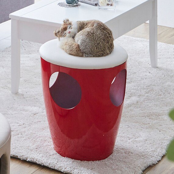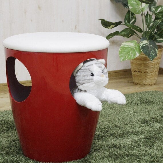 鮮やかな赤色がおしゃれな「ネコちゃんの秘密基地スツール」です。モダンなデザインなので、部屋の雰囲気を格上げしてくれそうです。