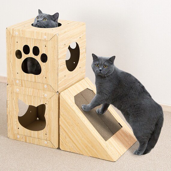 猫の隠れ家だけでなく、爪とぎもセットになっているアイテムです。肉球型の窓もかわいいです。窓からおもちゃを入れて、猫と遊ぶこともできそうです。