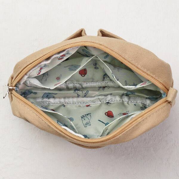 ポケットがたくさんついた使い勝手の良いサイズです。ねこ型チャーム付き。サイズは、(約)高さ195×142×55mmとなっています。裏地も猫プリントの生地というところも可愛いですね。