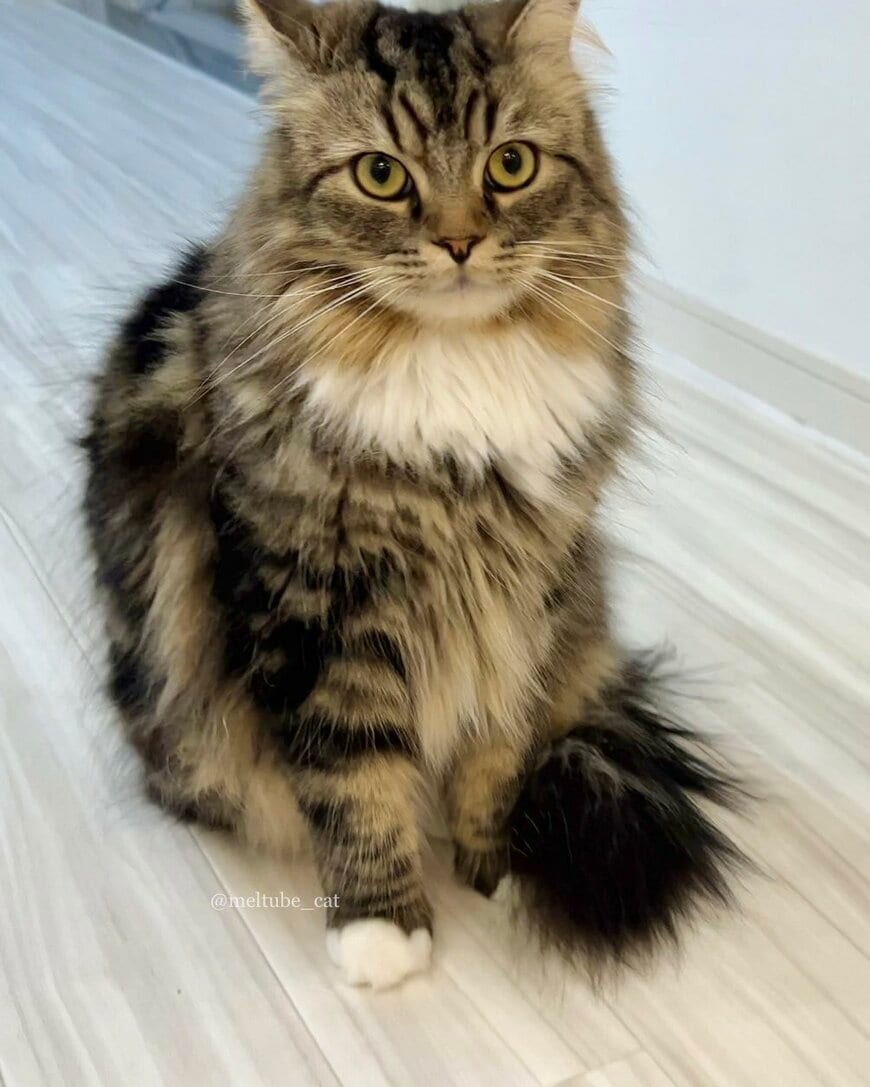 写真に写っているのは1匹の猫ちゃん。フサフサでつややかな毛並みと、きゅるんとしたまん丸の瞳が印象的な「メル」くんです。普段はとってもおしゃべりで、なにかと鳴いてお話してくれる猫ちゃんだといいます。