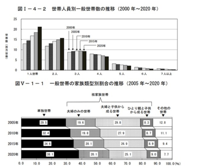 上記データから分かるとおり、シングル世帯は年々増加しています。2005年から2020年にかけてシングル世帯数は約1.64倍に増加。2020年には総世帯の38%を占めるまでに増えています。
