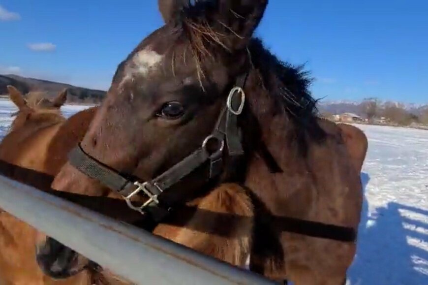 尻尾を噛んでいる鹿毛の幼駒は「アル」で、噛まれている栗毛の幼駒は「ルー」と牧場では呼ばれています。