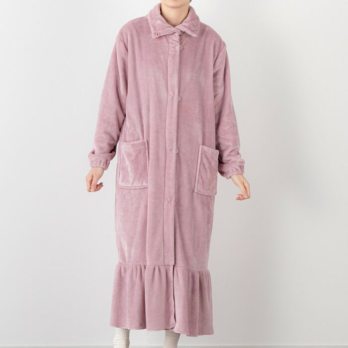 くすみカラーと裾の部分に入ったフリルがかわいらしい、ロング丈の着る毛布。こちらも吸湿発熱、抗菌防臭、制菌加工がされているほか、手作業がしやすい袖ゴムも入っています。また、首元部分についたボタンで温度調整をすることが可能で、寒いときはボタンを留めて首を覆うタイプに、暑苦しいきはボタンをはずして襟つきのタイプにと、寒さに遭わせてシルエットを変えることもできます。
