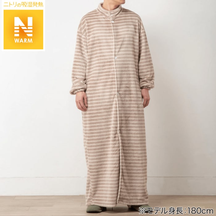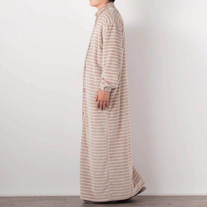 細いボーダー柄がアクセントになった、男女兼用のロング丈の着る毛布です。吸湿発熱と蓄熱機能でぽかぽかとした暖かさが続くだけでなく、清潔さを保てる抗菌防臭と制菌加工もされている優れもの。袖にゴムが入っているので、ちょっとした水仕事や手作業をするときにも邪魔になりません。使わないときは、たたんでコンパクトに収納できるのもいいですね。