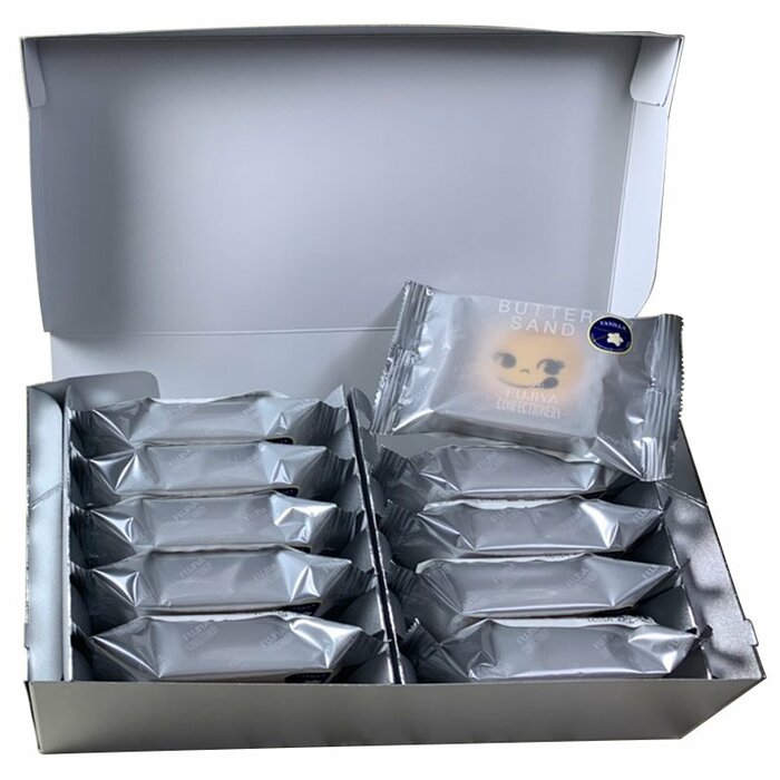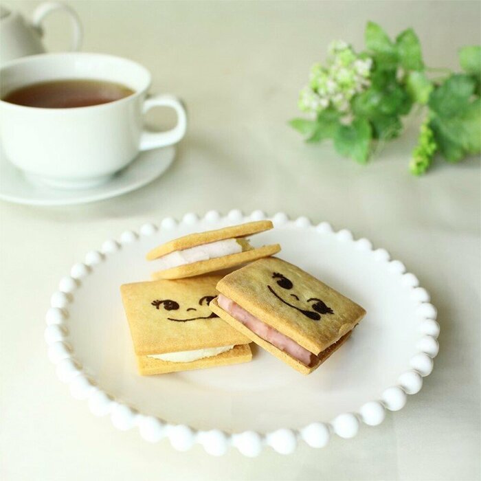 「バターサンド(バニラ&あまおう苺)」は不二家の新しいブランドである「FUJIYA CONFECTIONERY(フジヤコンフェクショナリー)」の一品です。表面にペコちゃんの顔が描かれていて、とてもキュート! 不二家の商品だとすぐにわかります。