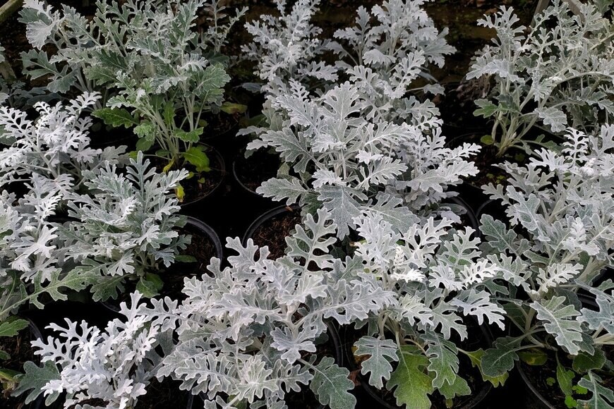 ふわふわとした質感で、レースのようなシルバーリーフが美しいシロタエギク。冬の寄せ植えに欠かせない常緑多年草です。