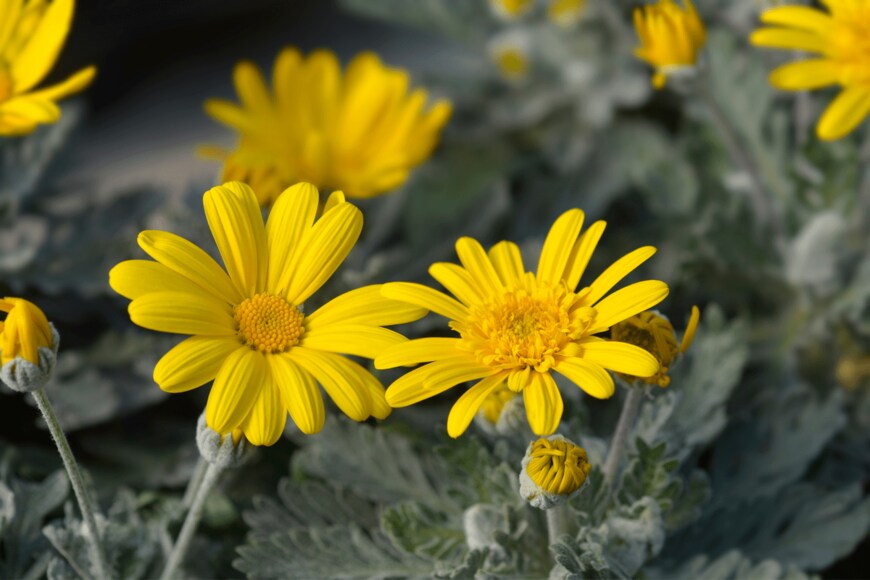 ユリオプスデージーはパッと咲き開く黄色い花が太陽のよう。大きめの花が冬花壇を明るく華やかにしてくれます。うぶ毛が生えている葉茎はシルバーグリーンでモダンな印象。
