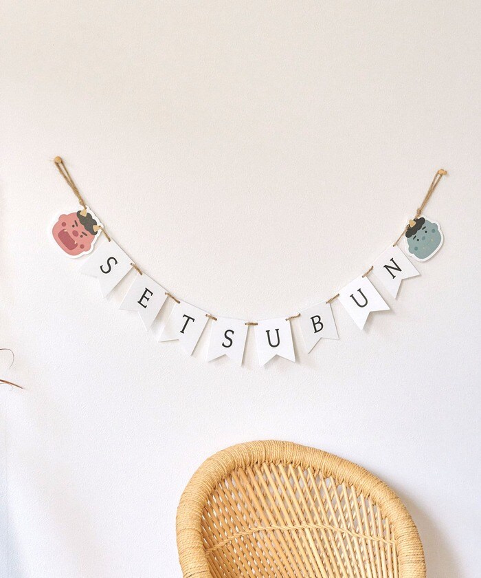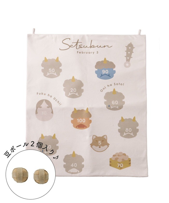 節分モチーフのデザインが可愛いタペストリーです。付属の豆ボールを投げて鬼退治の得点を競うゲームのようにして遊べます。柔らかい色味なので、お部屋に馴染みやすいのもうれしいポイントですね。