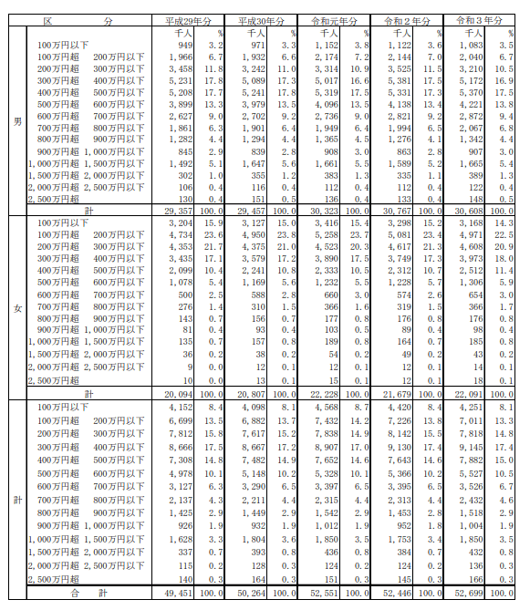 ここで、国税庁「民間給与実態統計調査(令和3年)」から日本人の年収について深掘りしておきましょう。