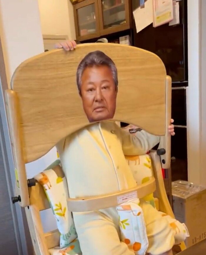 息子さんがベビーチェアのテーブル部分を持ち上げた際に、すべてが分かります。なんと、テーブルの裏側に梅宮辰夫さんの顔写真が張られているのです。