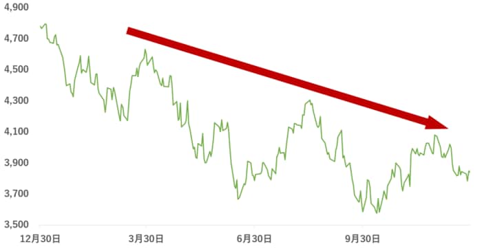 2022年半ばごろからは景気減速に対する懸念も高まっていったこともあり、たとえば下図の米国株式の値動きのように、2022年の株式市場は総じて不調でした。
