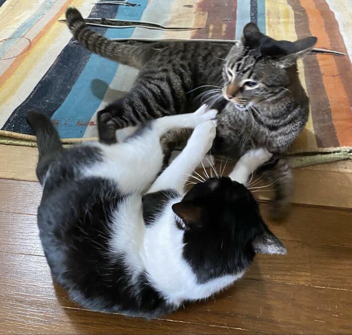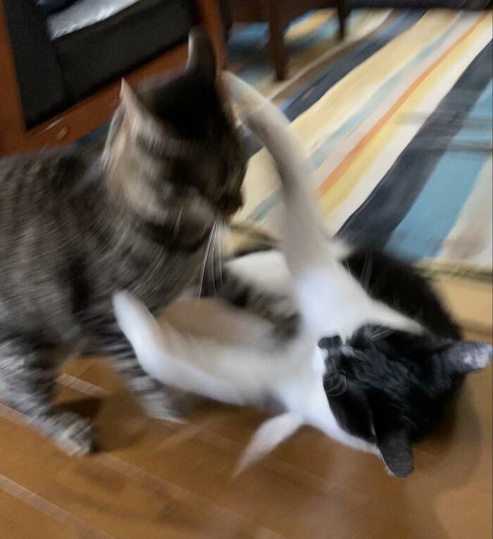 最後に添えられた写真には、猫パンチを繰り出す2匹の姿が写っていました。残像から動きの早さや躍動感が伝わってきます。